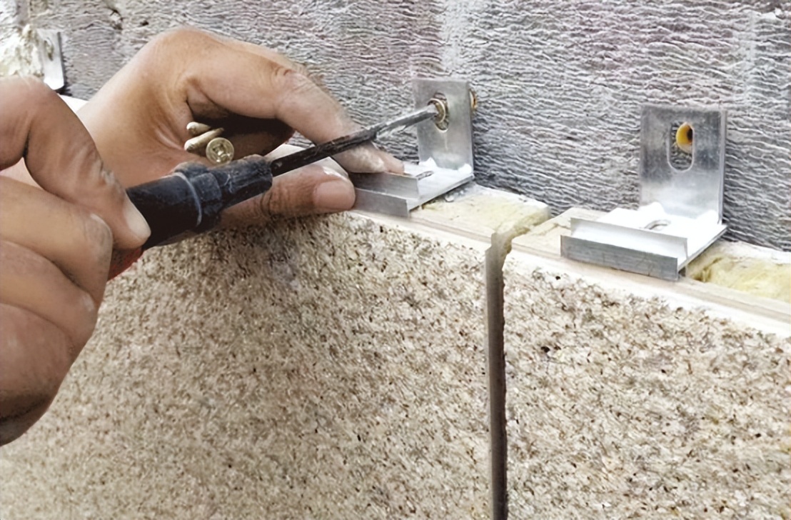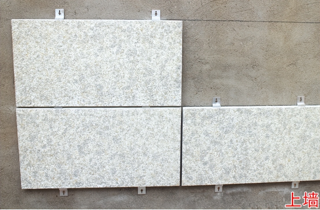 打孔埋置錨栓,固定錨固件。L型錨固件與H型掛件的連接件通過(guò)膨脹螺栓固定。