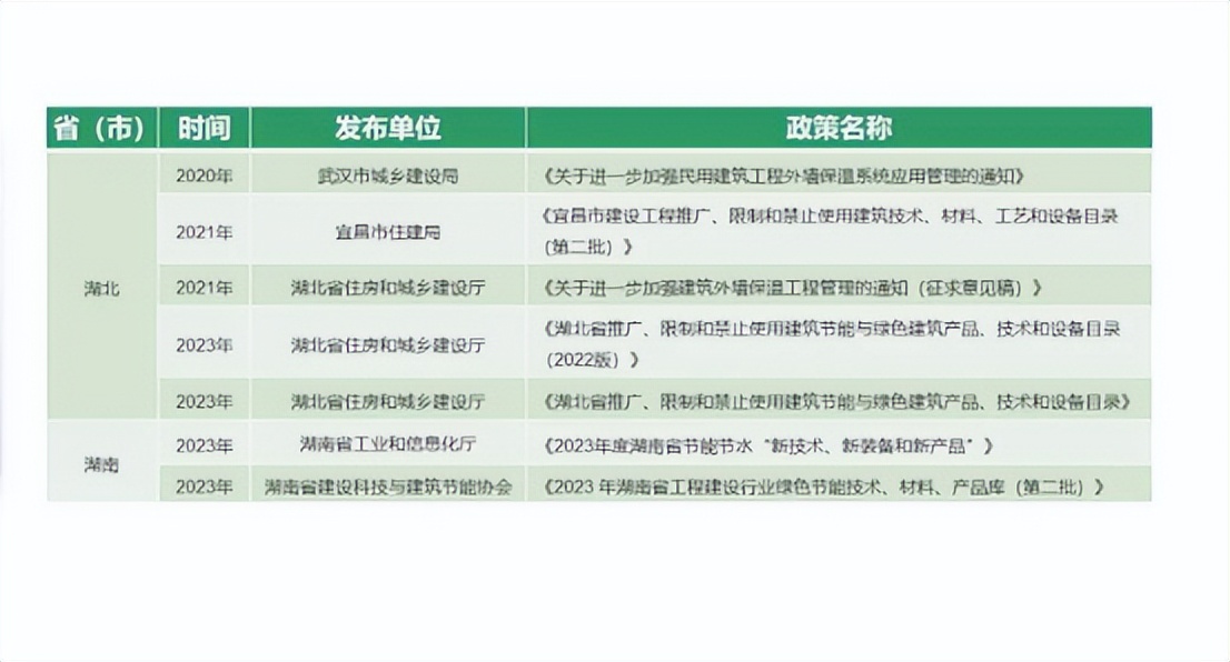 2023年,湖北省住房和城鄉(xiāng)建設(shè)廳發(fā)布《湖北省推廣、限制和禁止使用建筑節(jié)能與綠色建筑產(chǎn)品、技術(shù)和設(shè)備日錄(2022版)》,保溫裝飾板外墻外保溫系統(tǒng)列入推廣和使用目錄。